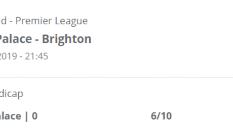 England Premier League Crystal Palace – Brighton, Asian Handicap 0 Crystal Palace, Stake 6/10, odd 1.90 at Pinnacle Sports (1-1 DRAW) PREVIEW: Crystal Palace find themselves unbeaten in their last three Premier League (PL) games (W2, D1), their joint-longest streak in the league without a loss this season. They face fierce rivals Brighton and Hove